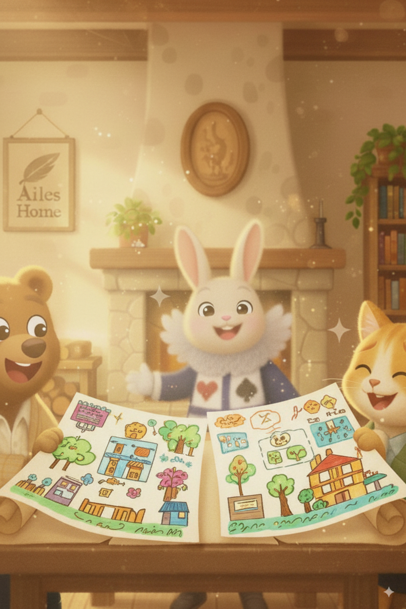 理想の間取りプランが完成!「これで完璧!」と夢が膨らむくまさんとねこさん。
